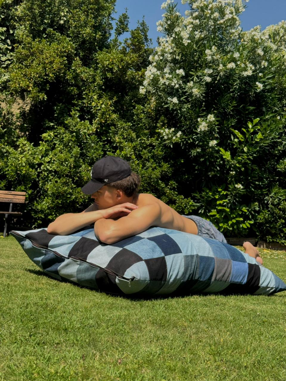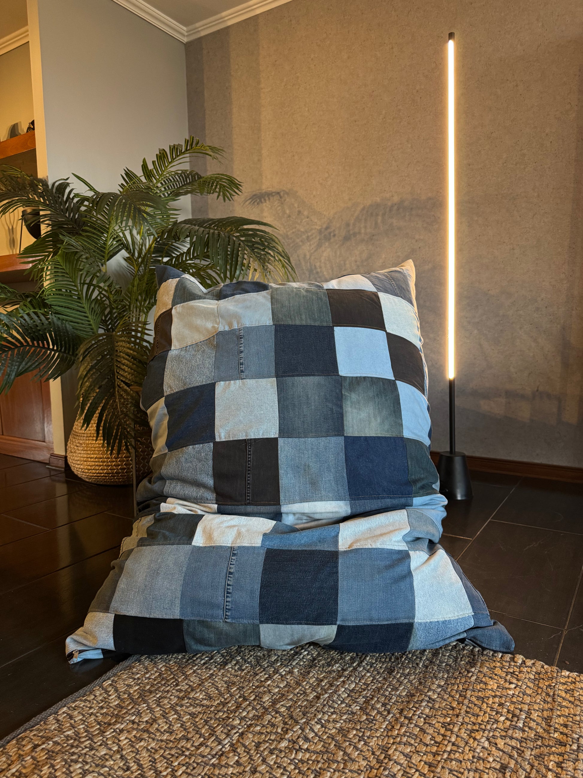 Cada Puff XL está hecho a mano, uno por uno, utilizando jeans reutilizados en una funda de patchwork artesanal. El resultado es un objeto único: ningún patrón se repite, ninguna combinación es igual a otra.